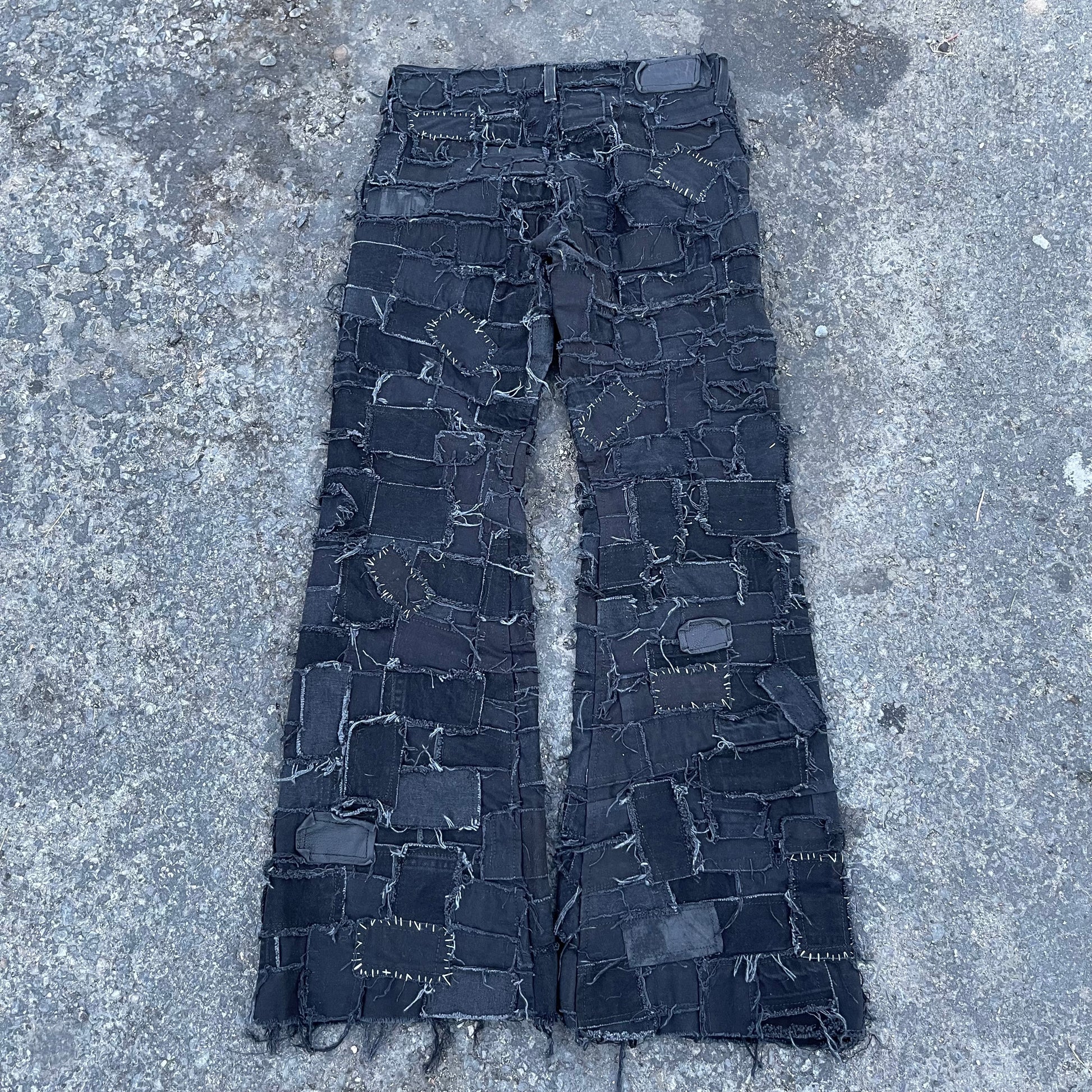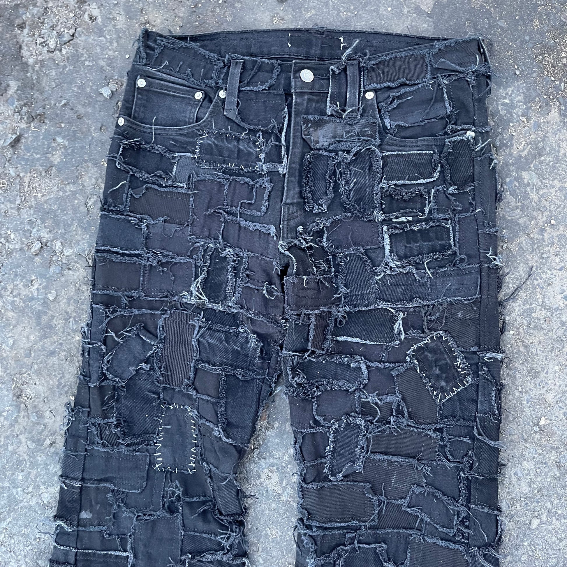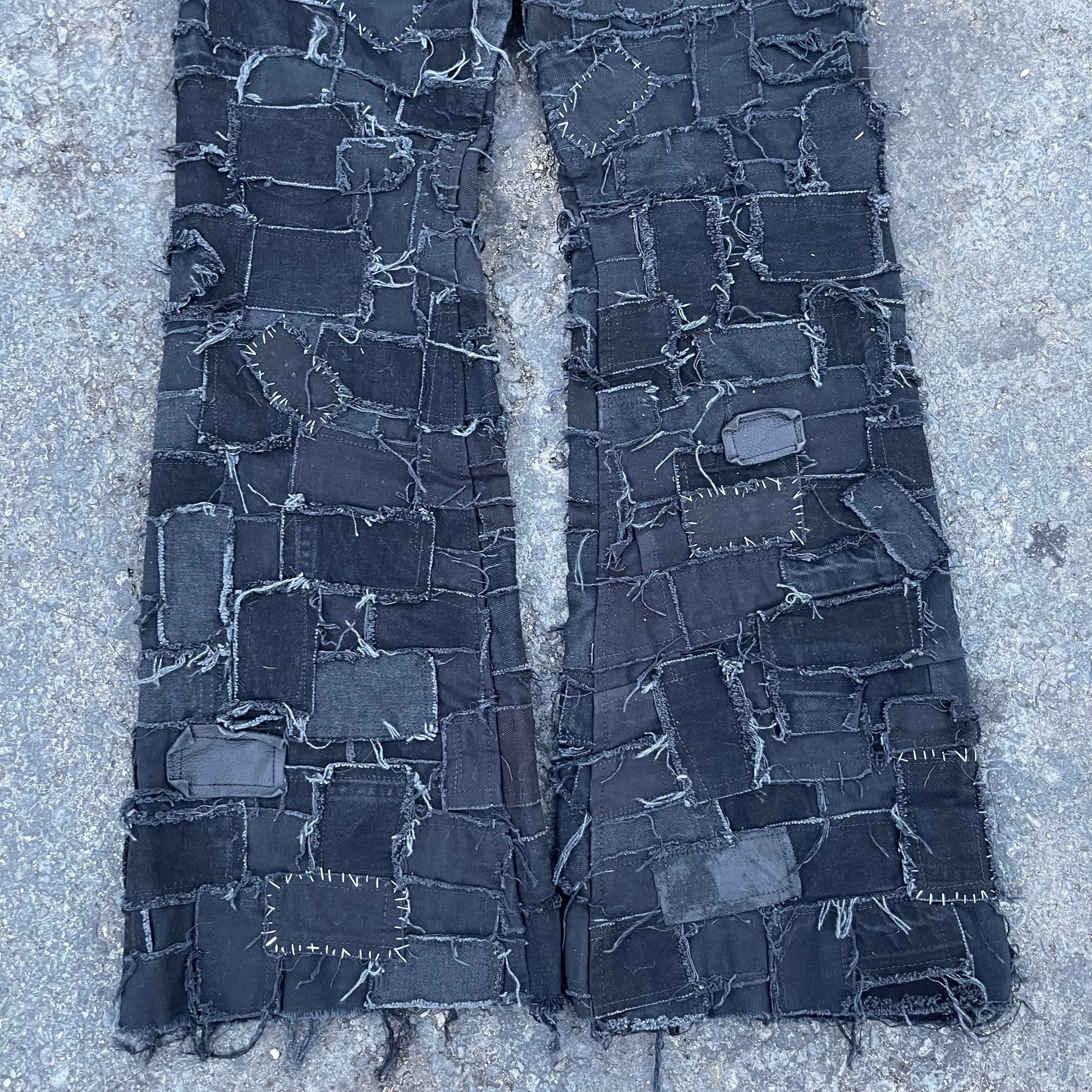 Black on black denim patchwork jeans, this piece took over 30+ hours of cutting, pinning, and sewing.