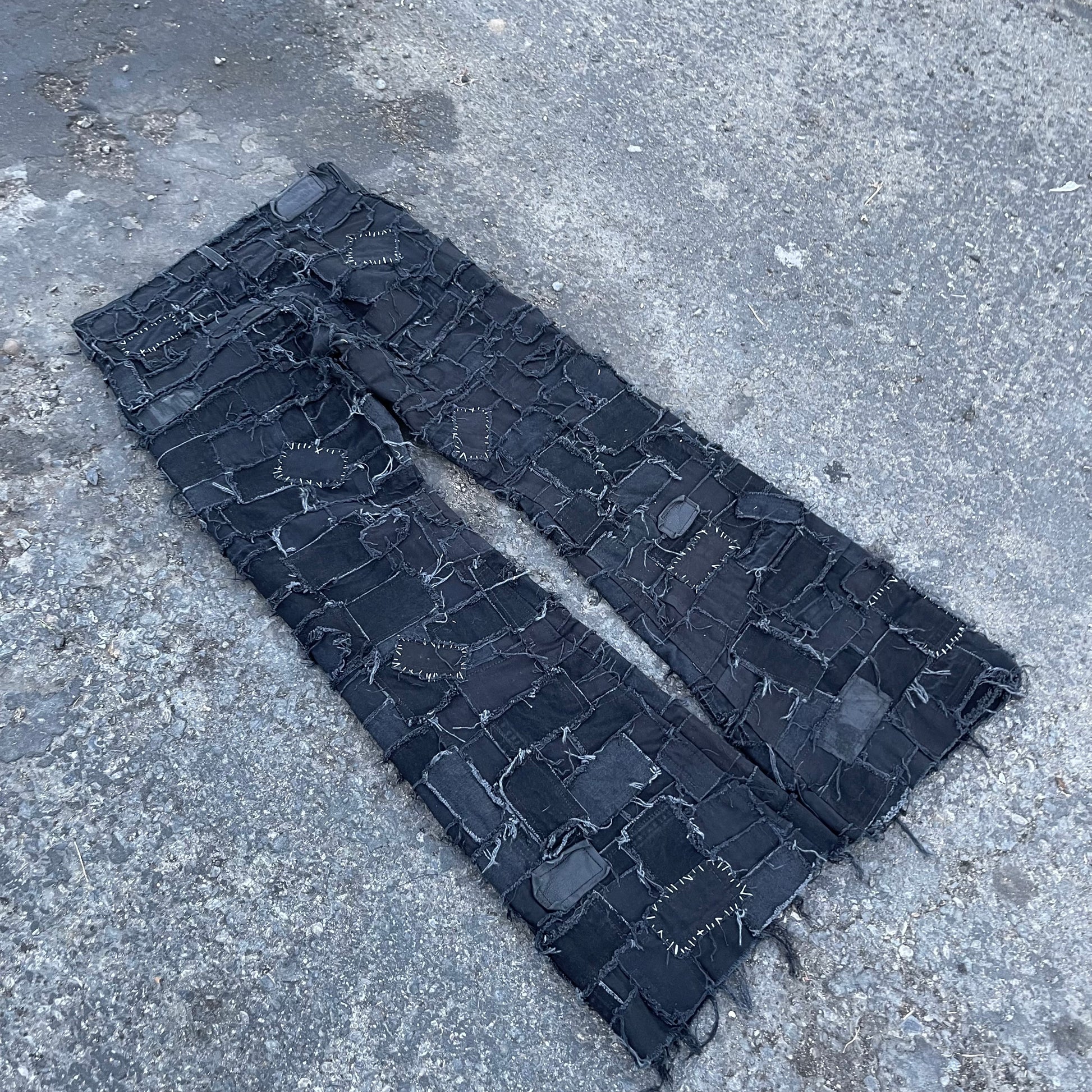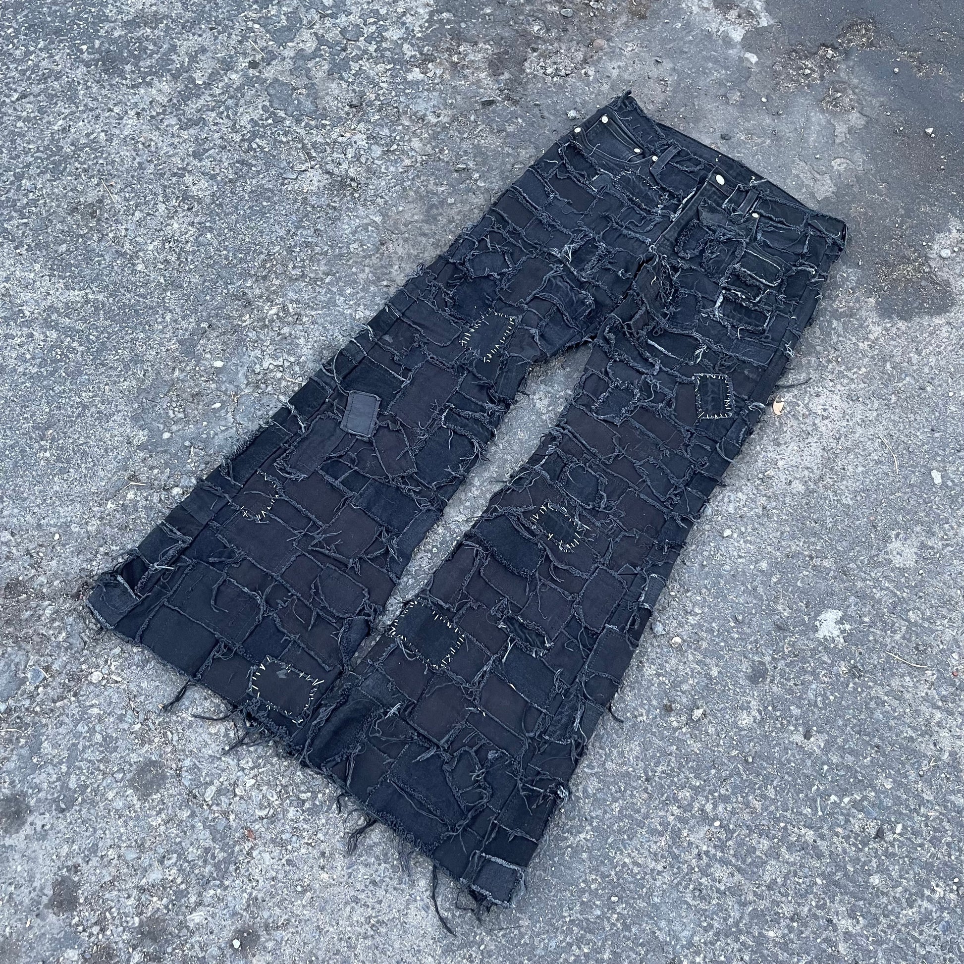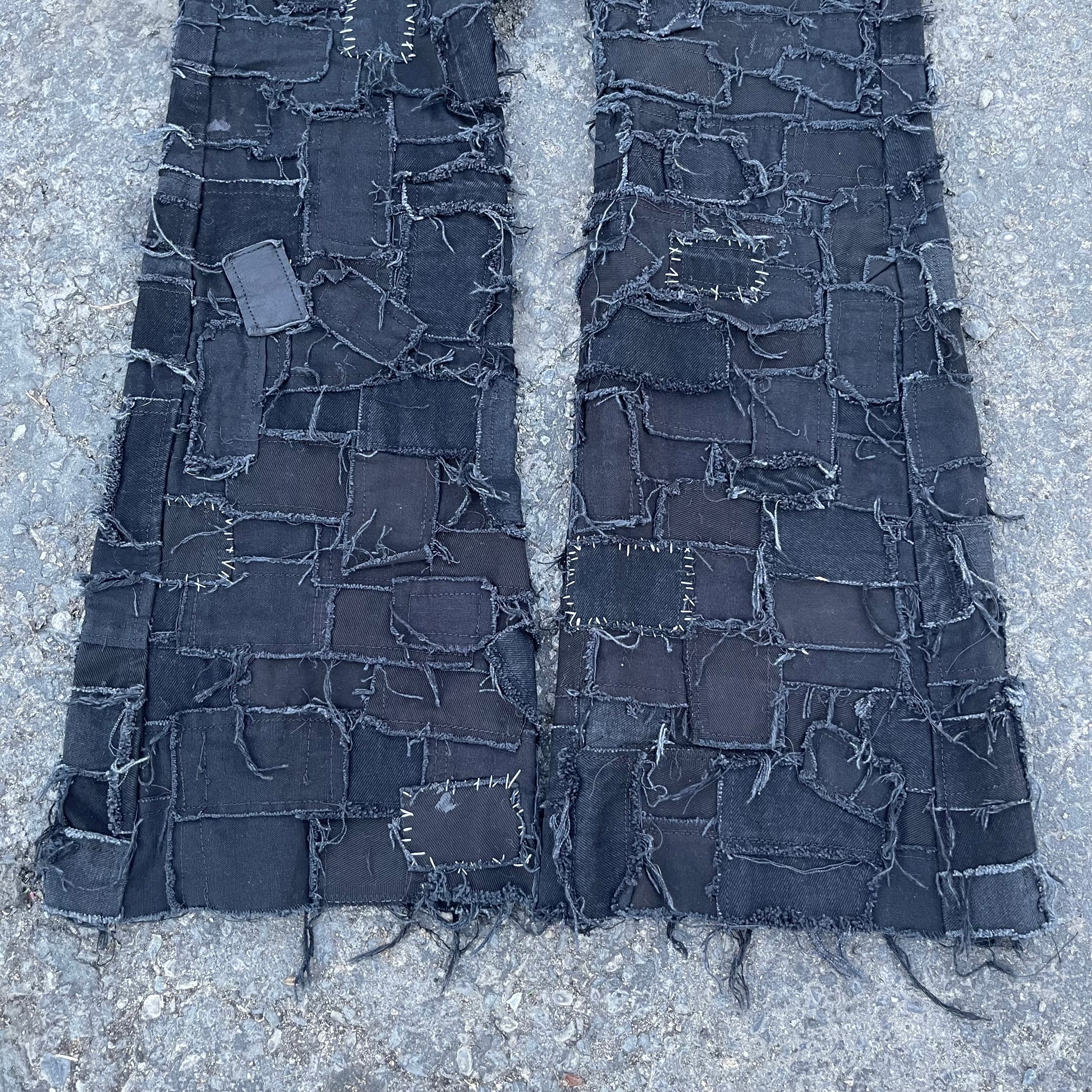 Black on black denim patchwork jeans, this piece took over 30+ hours of cutting, pinning, and sewing.