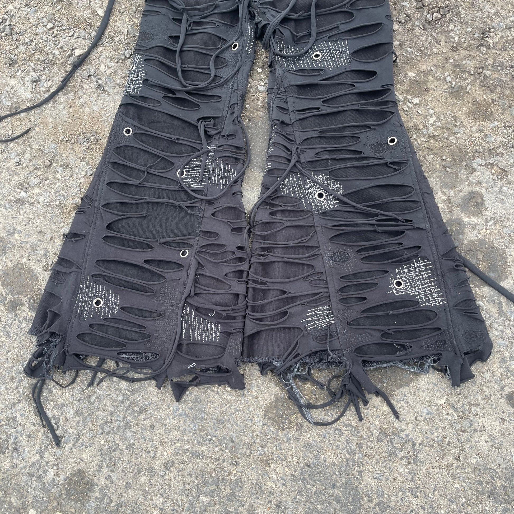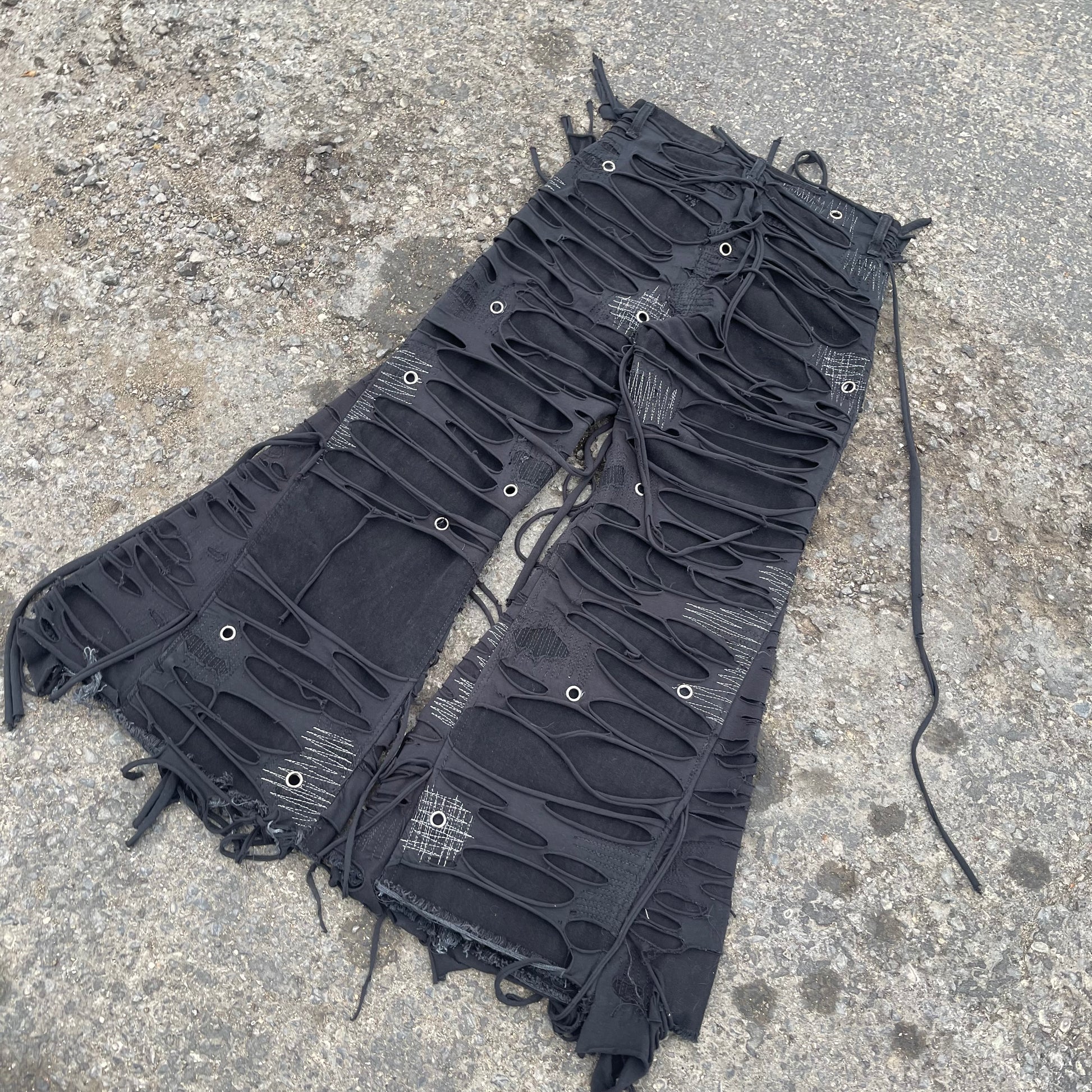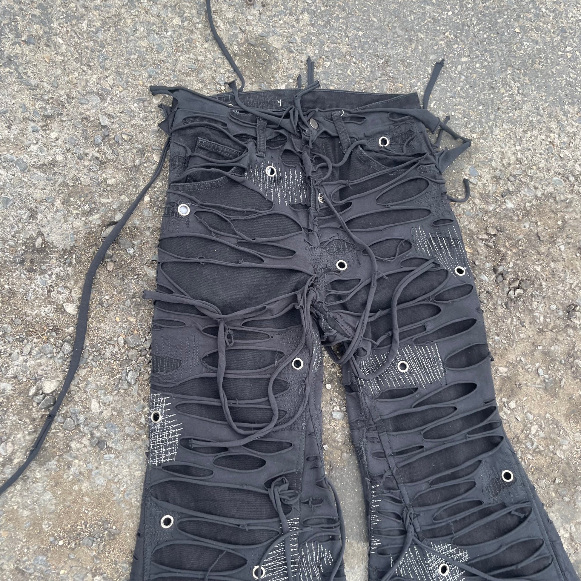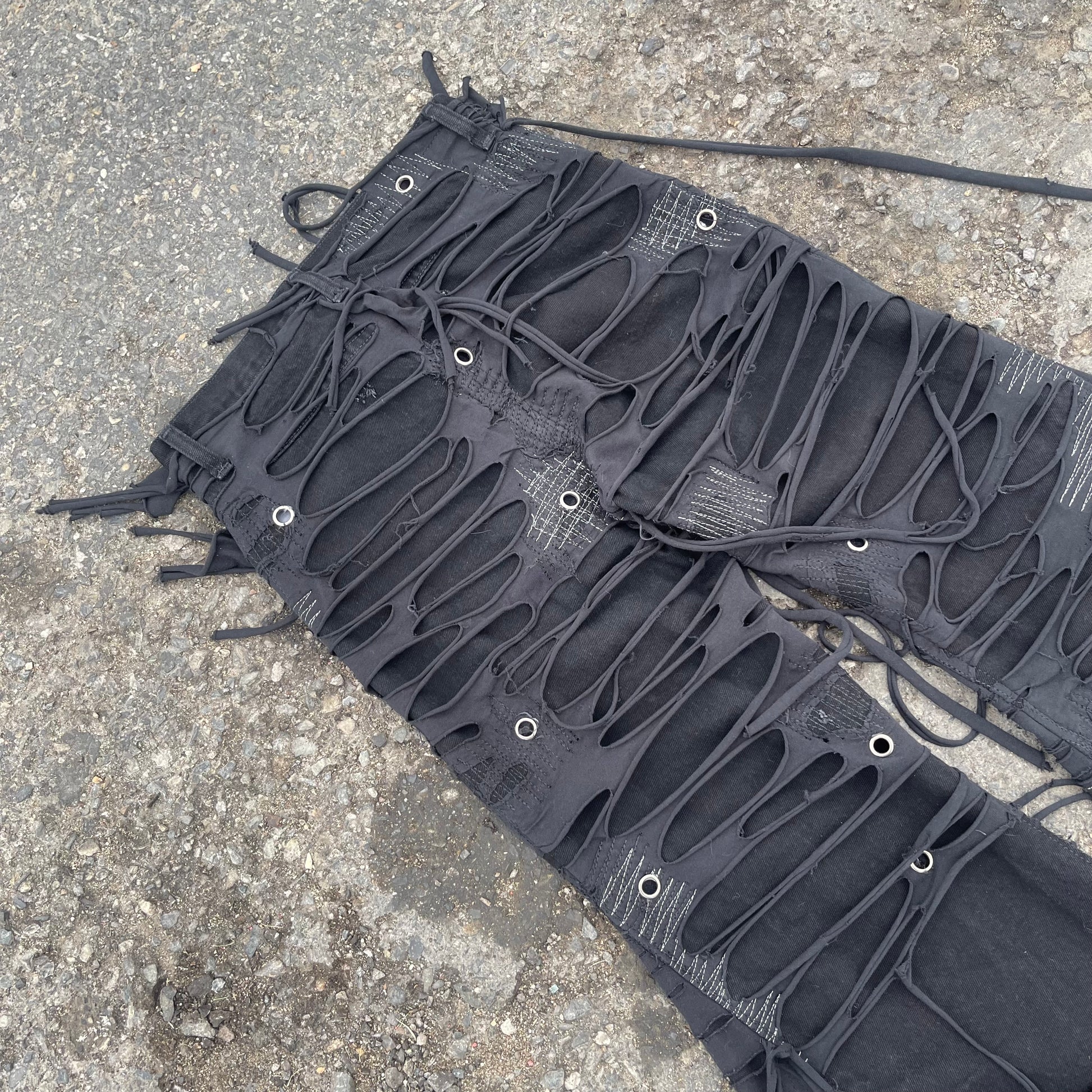 My signature TTORN denim one of my most known and favorited pieces. Using black jersey knit which is then distressed and sewn on top of black denim.
