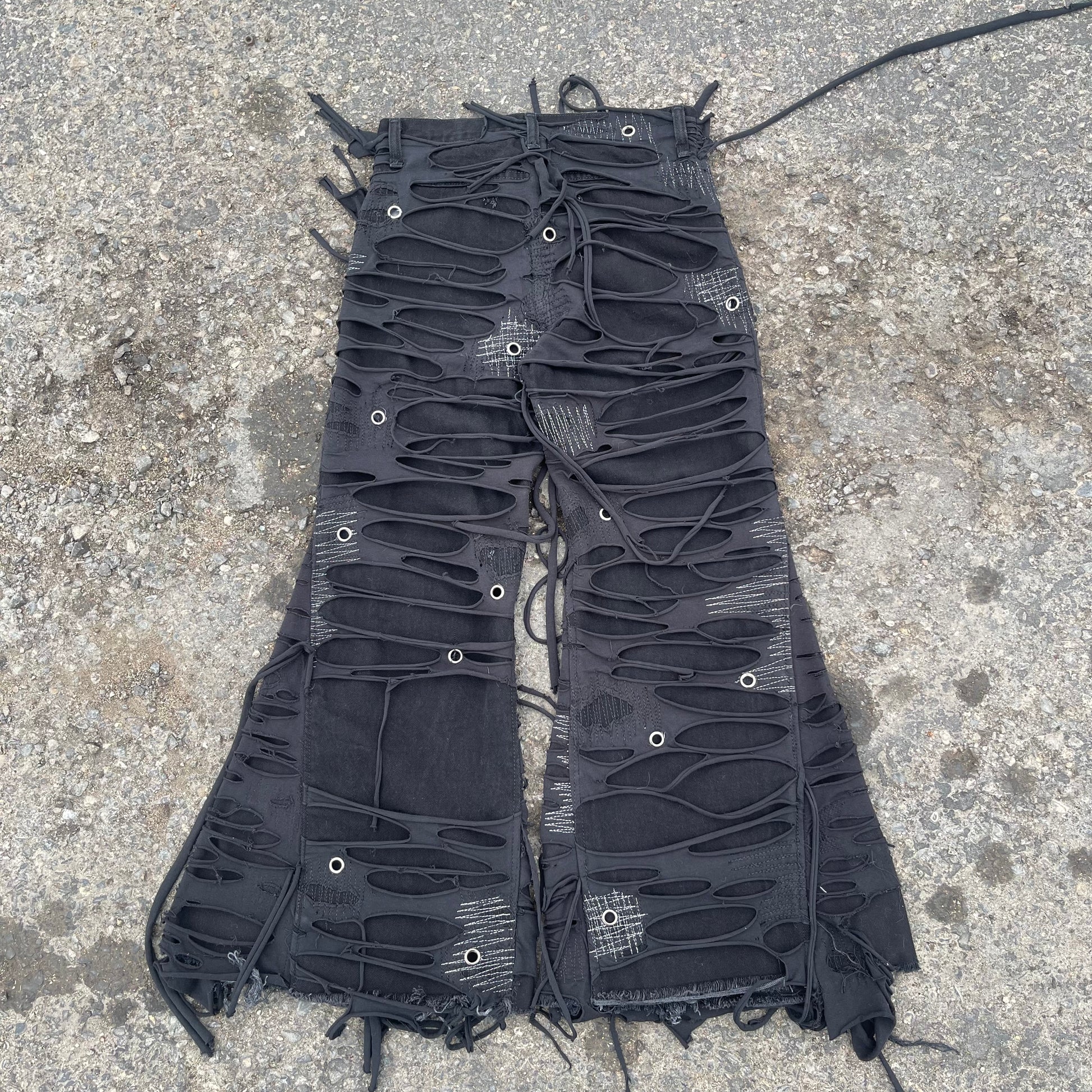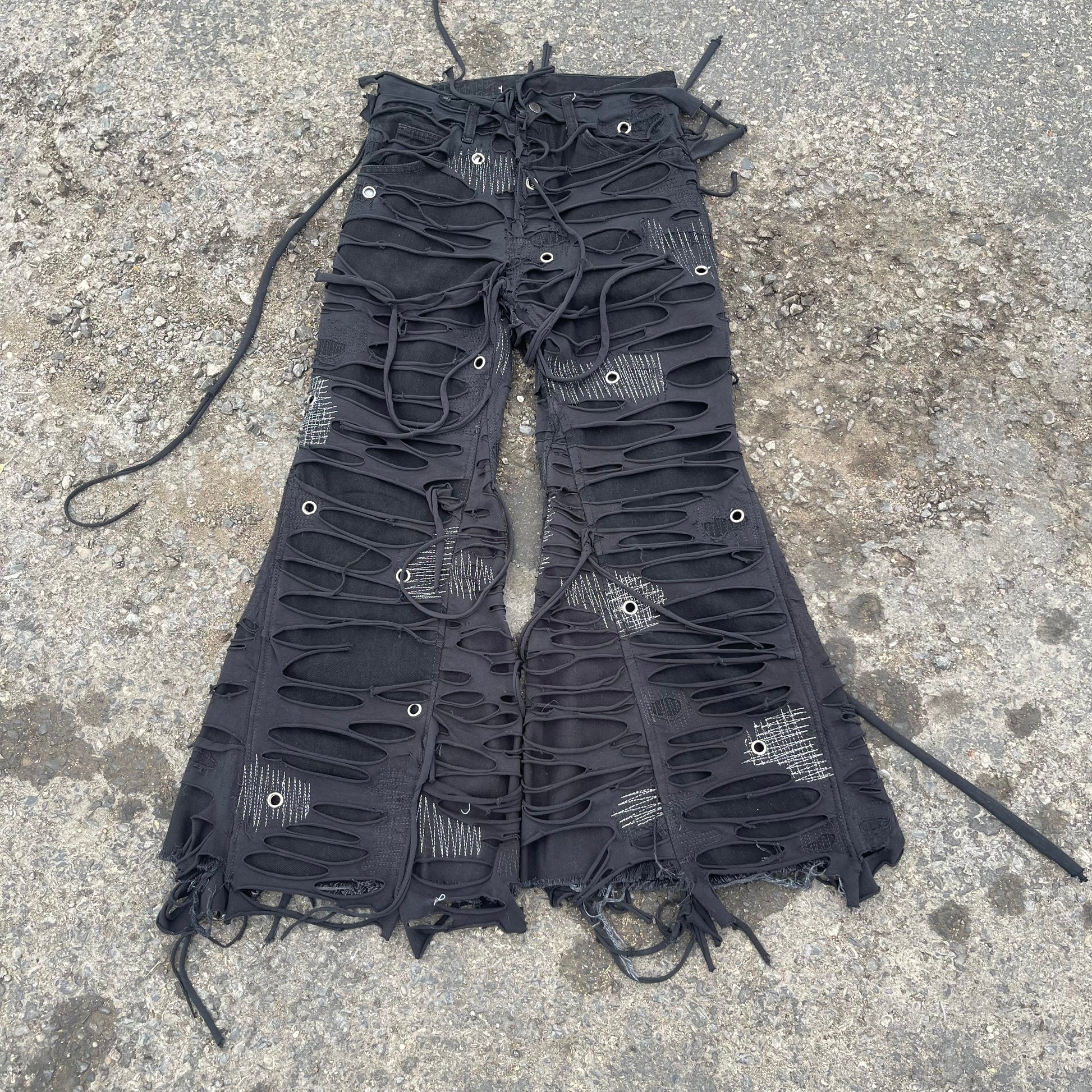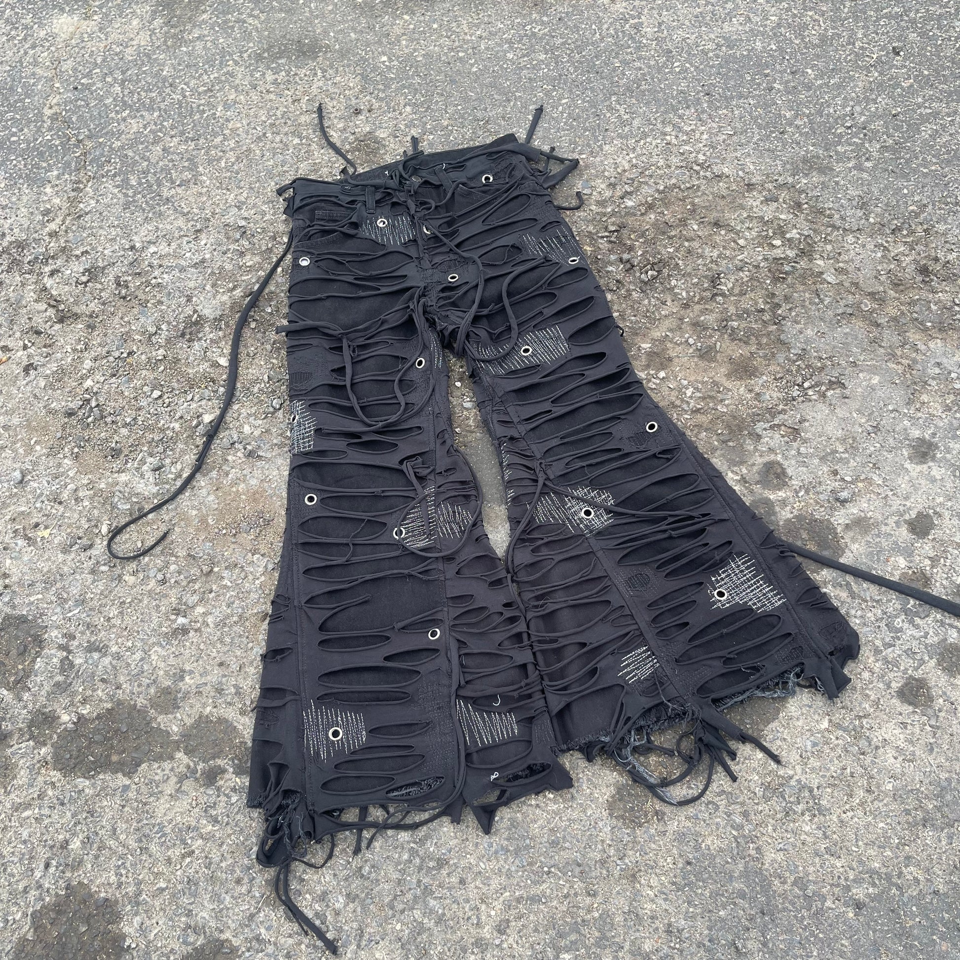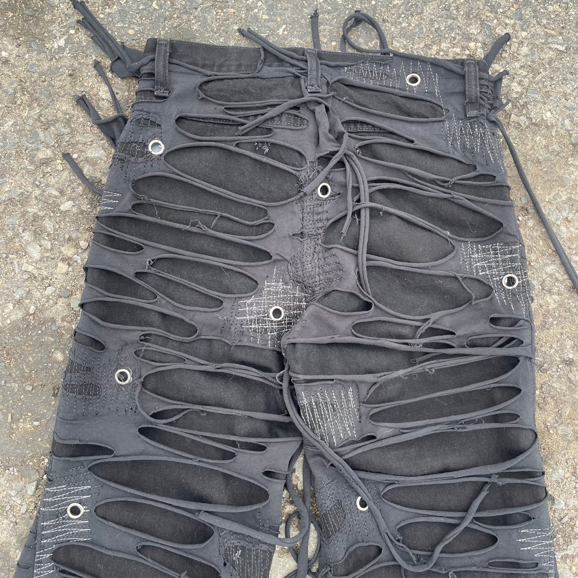 My signature TTORN denim one of my most known and favorited pieces. Using black jersey knit which is then distressed and sewn on top of black denim.